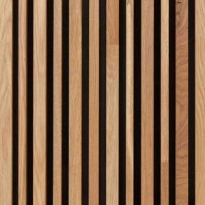 Construction: 1-1/4” wide x 1” deep slats spaced 3/4” apart, installed on 1/2" FSC Certified, 5-ply Birch plywood with Class A fire retardant applied. Slats may contain finger joints. Plywood stained black with low-VOC stain.